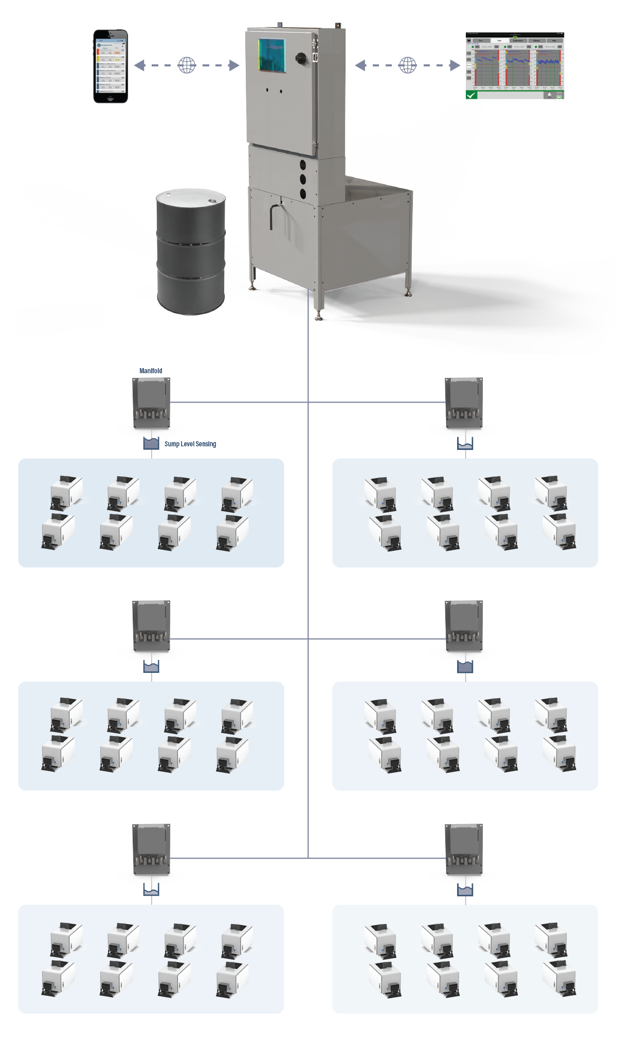 Simple and flexible connections to main unit. Controlled by Ethernet cable and fluid distributed in series or parallel to manifolds.